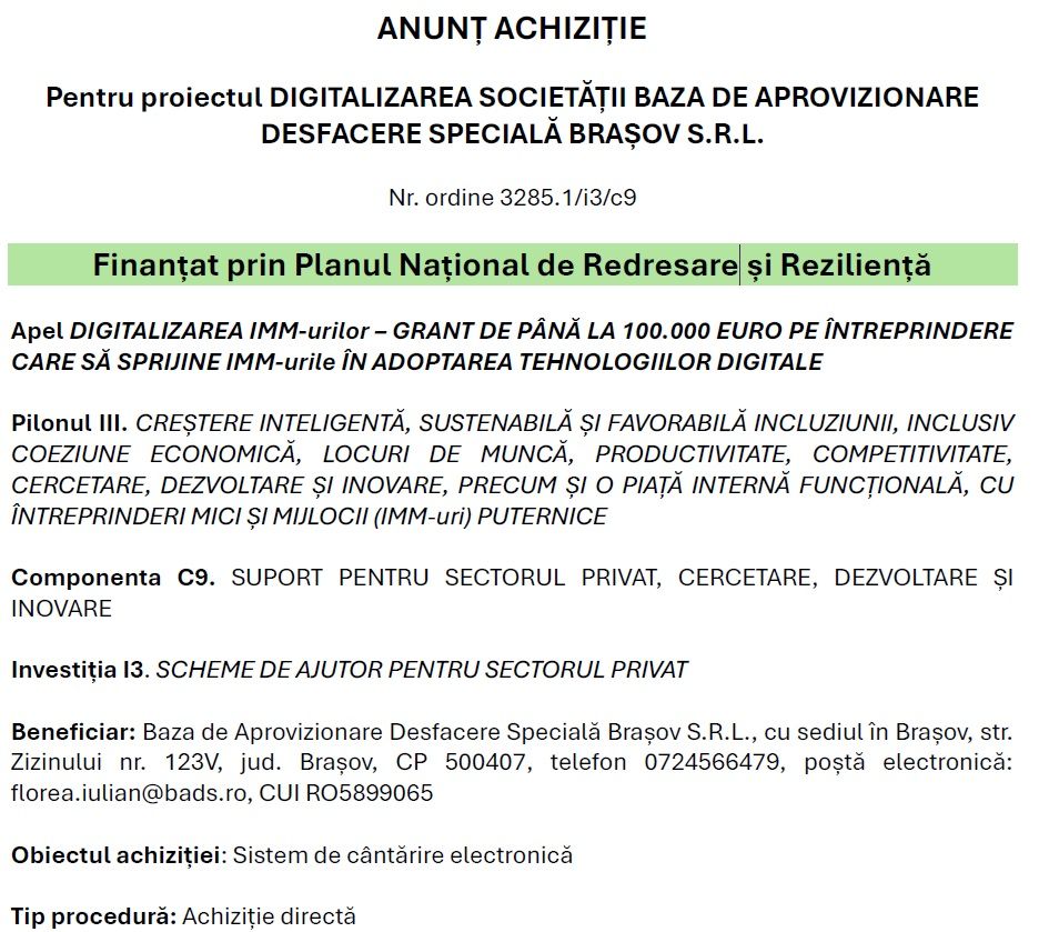 Nr. înreg. 22 din 27.08.2025ANUNÈš ACHIZIÈšIEPentru proiectul DIGITALIZAREA SOCIETĂȚII BAZA DE APROVIZIONARE DESFACERE SPECIALÄ‚ BRAȘOV S.R.L.Nr. ordine 3285.1/i3/c9 FinanÈ›at prin Planul NaÈ