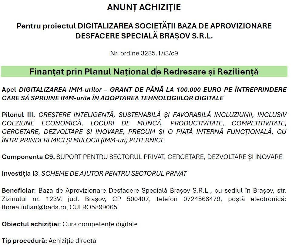 Nr. înreg. 20 din 27.08.2025ANUNÈš ACHIZIÈšIE Pentru proiectul DIGITALIZAREA SOCIETĂȚII BAZA DE APROVIZIONARE DESFACERE SPECIALÄ‚ BRAȘOV S.R.L.Nr. ordine 3285.1/i3/c9 FinanÈ›at prin Planul Na